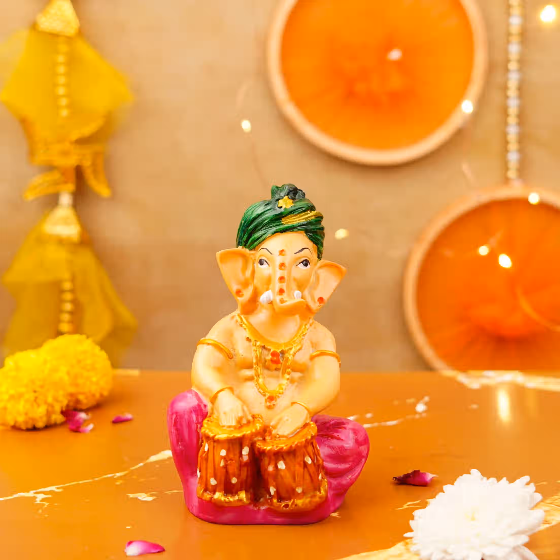 The idol showcases Ganesha seated comfortably, wearing a vibrant green pagdi and skillfully playing the tabla, representing rhythm, celebration and the joy of life