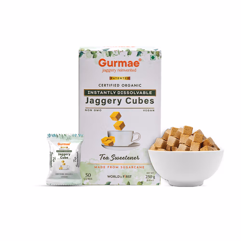 Certified organic jaggery cubes, instantly dissolvable, perfect for sweetening tea, offering a healthy and convenient alternative to sugar