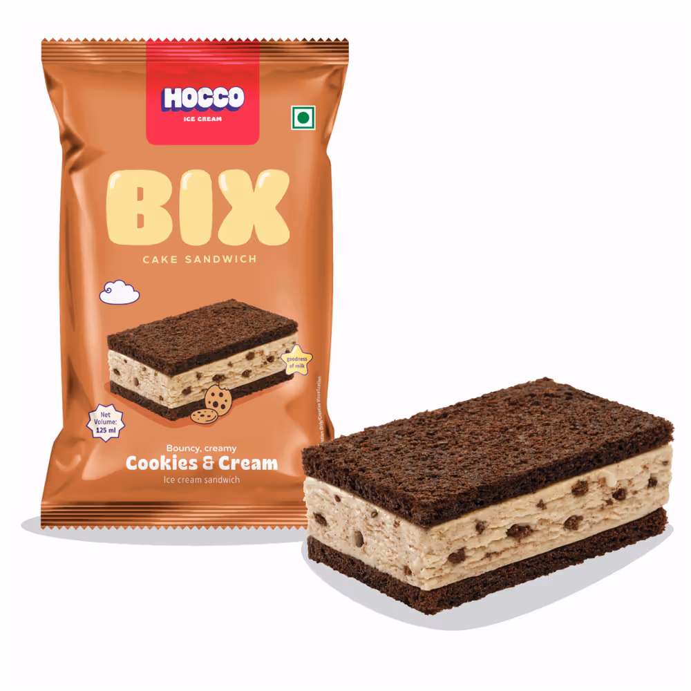 Enjoy the ultimate dessert experience with Hocco Bix cake cookies and cream ice cream sandwich. Indulge in creamy cookies and cream ice cream sandwiched between two soft, cake-like cookies