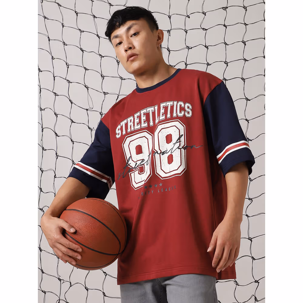 Bold varsity-style typography print, contrast navy sleeves with stripes, drop-shoulder oversized design