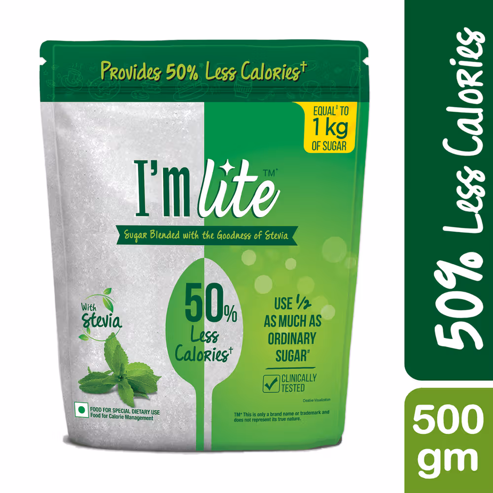 50% fewer calories than sugar, natural stevia blend, ideal for cooking and baking, equivalent sweetness to sugar