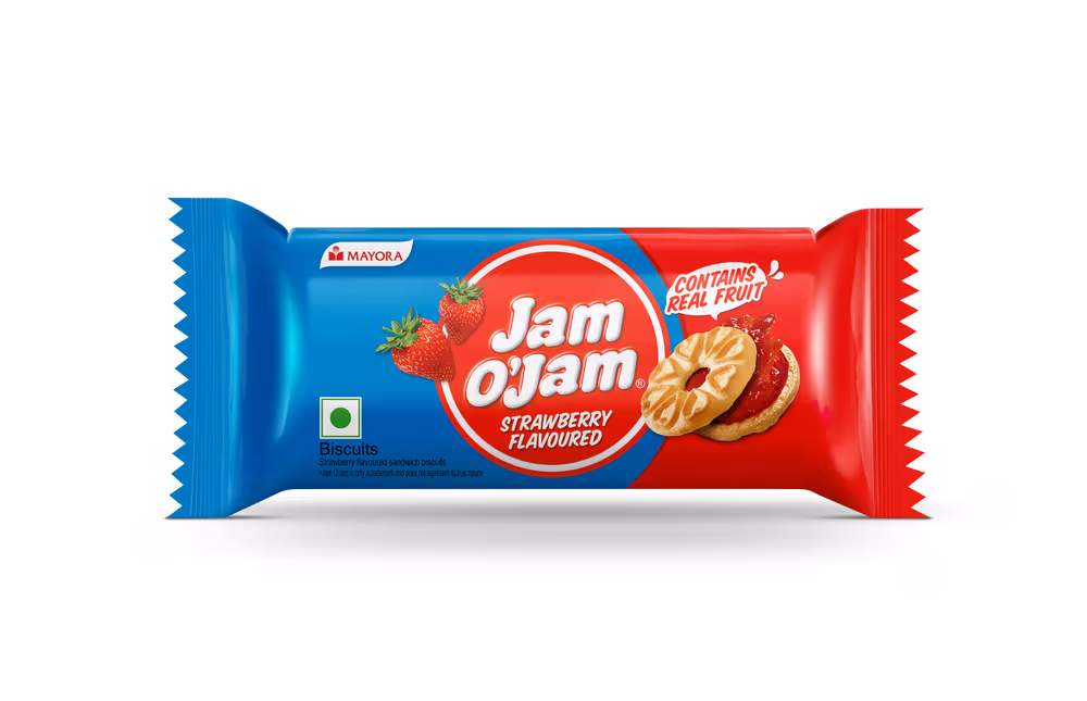 Delicious strawberry flavored cream filled sandwich biscuits, perfect for snacking anytime