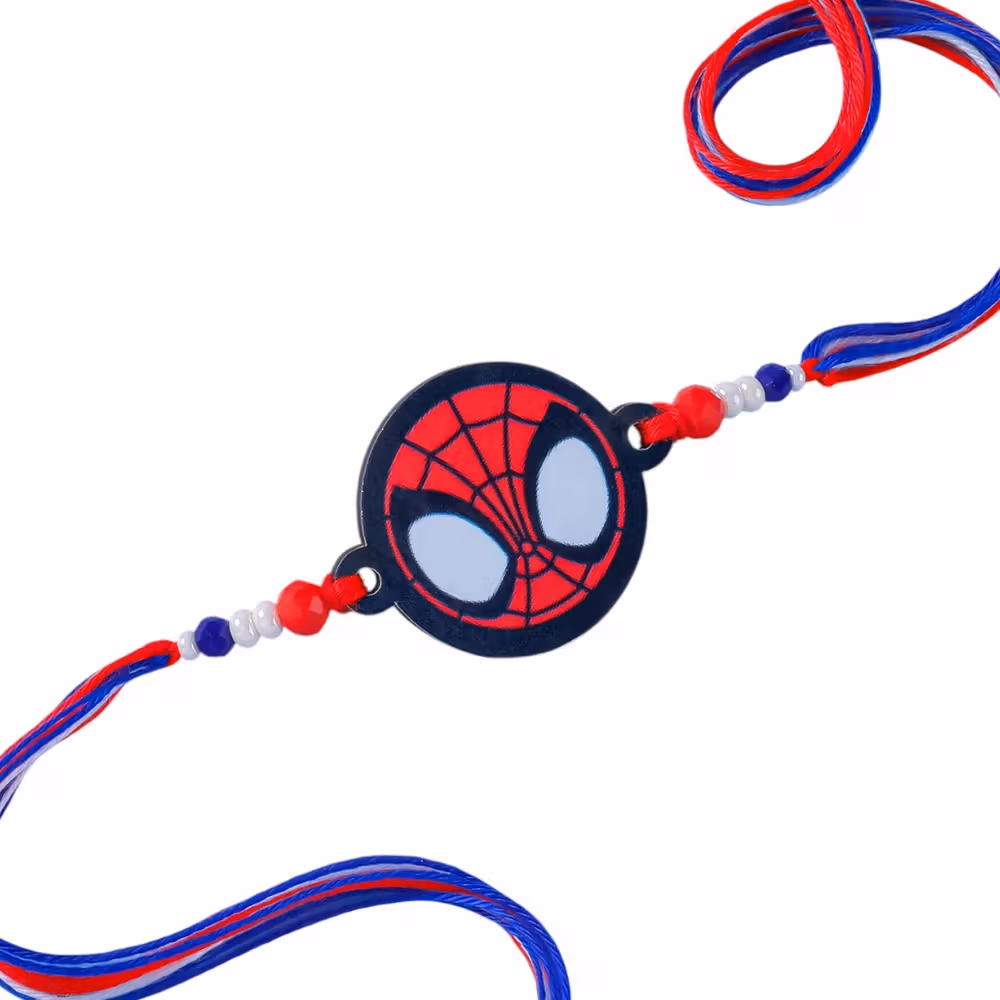 Superhero-inspired Spiderman design, vibrant red and blue threads, comes with traditional roli chawal, durable MDF construction