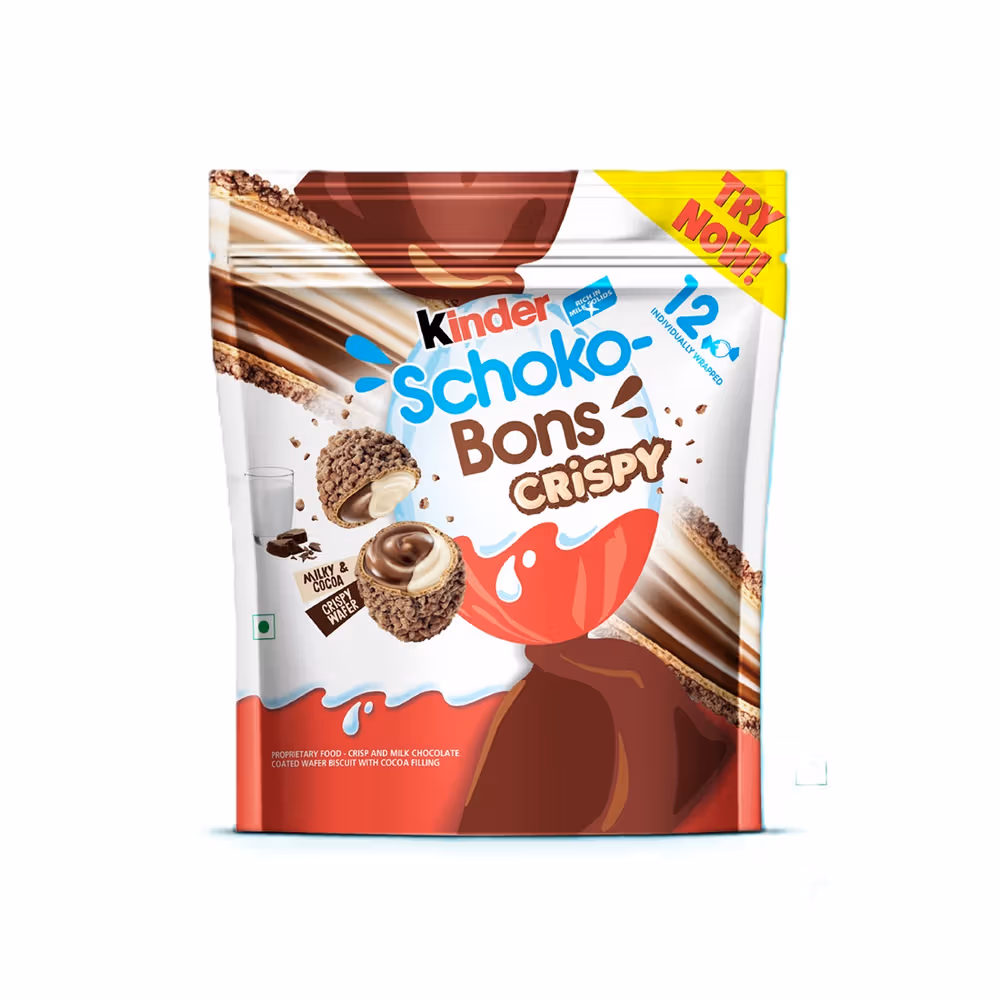 Kinder Schoko-Bons Crispy is a delicious chocolate bite with a multi-sensorial experience made of a creamy milk and cocoa filling in the center with a crunchy wafer biscuit covering, topped with cocoa sprinkles. These are individually twist wrapped chocolates which are packed in 2 shareable packs of 4 & 12.