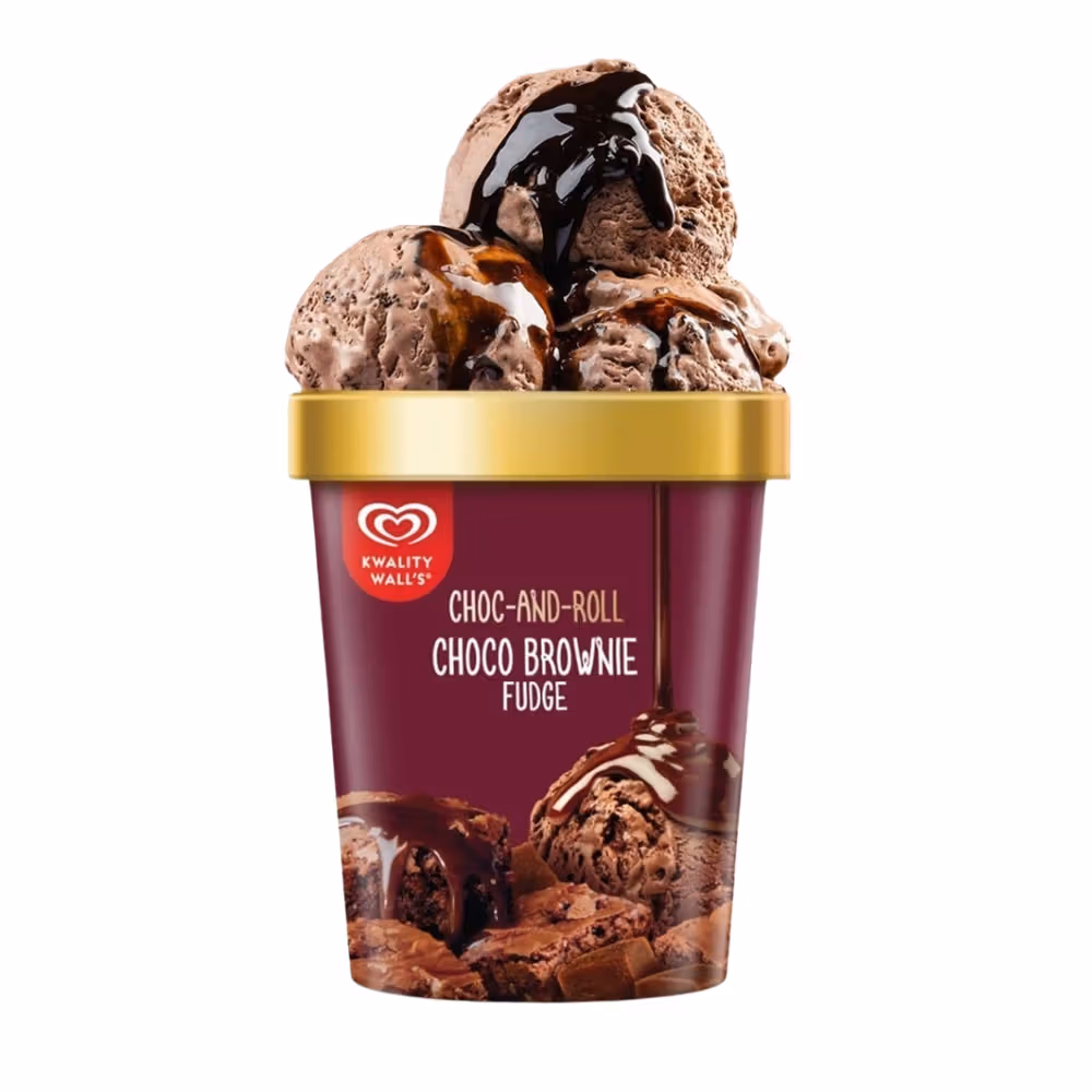 Rich chocolate brownie pieces in every bite, velvety smooth texture melts in mouth, perfect dessert for sharing with family, convenient tub packaging for easy serving