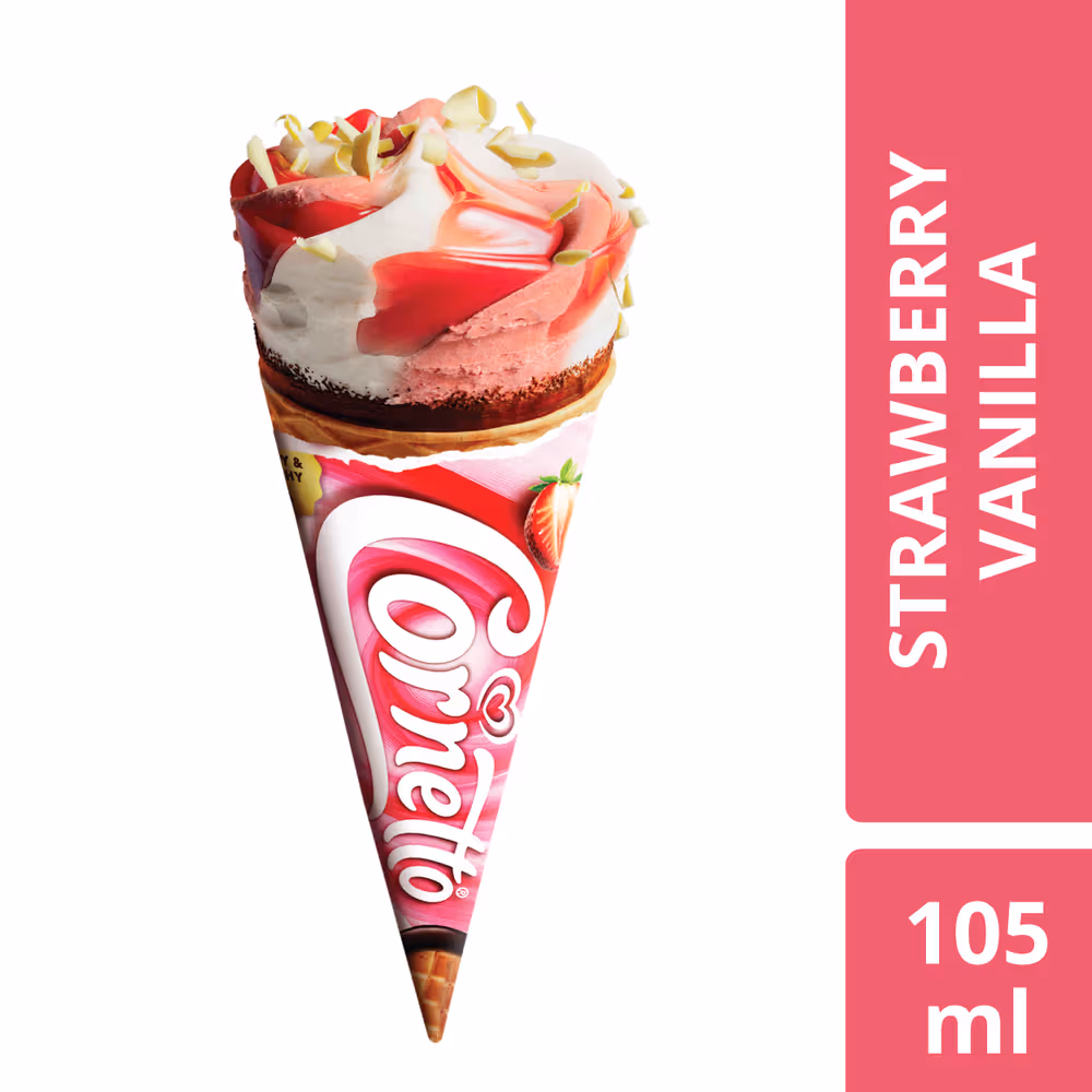 Perfect blend of strawberry and vanilla, Crispy cone with chocolate chip topping, Creamy texture with crunchy elements