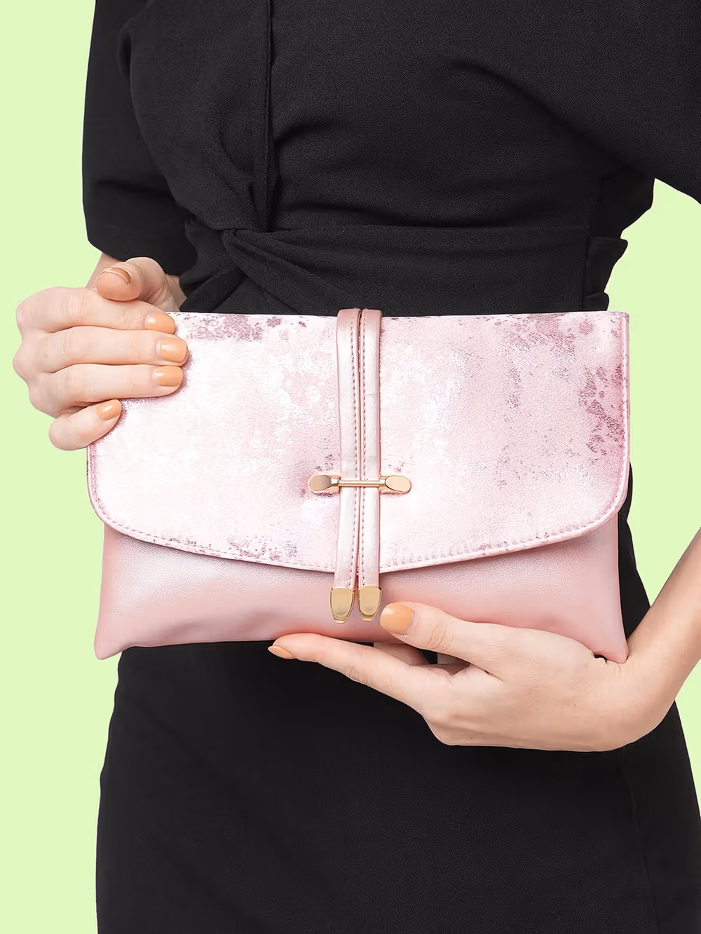 Premium metallic textured finish, Detachable metal chain strap, spacious main compartment, secure zip pocket for valuables