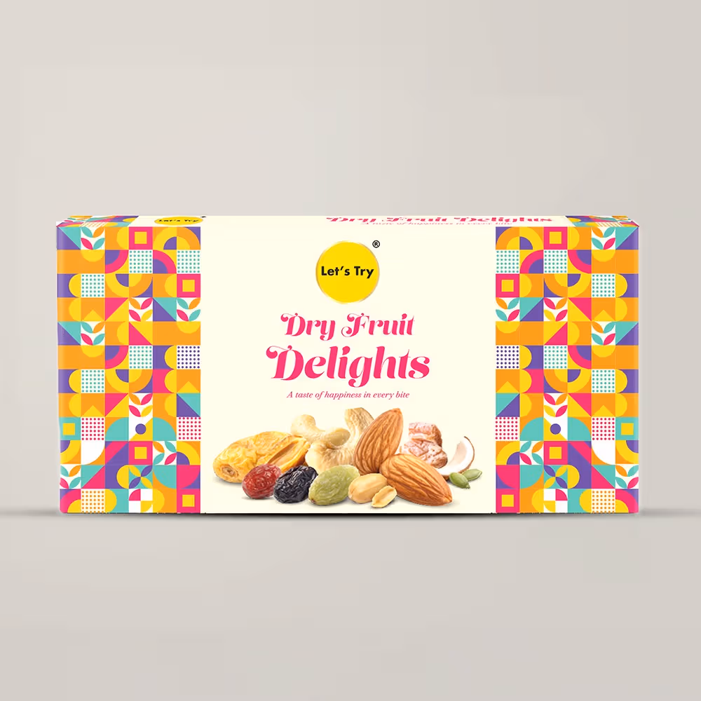 This dry fruit delight gift box features a vibrant selection of trail mix, snack mix, and crunchy nut mix, perfect for gifting or snacking with a savory twist