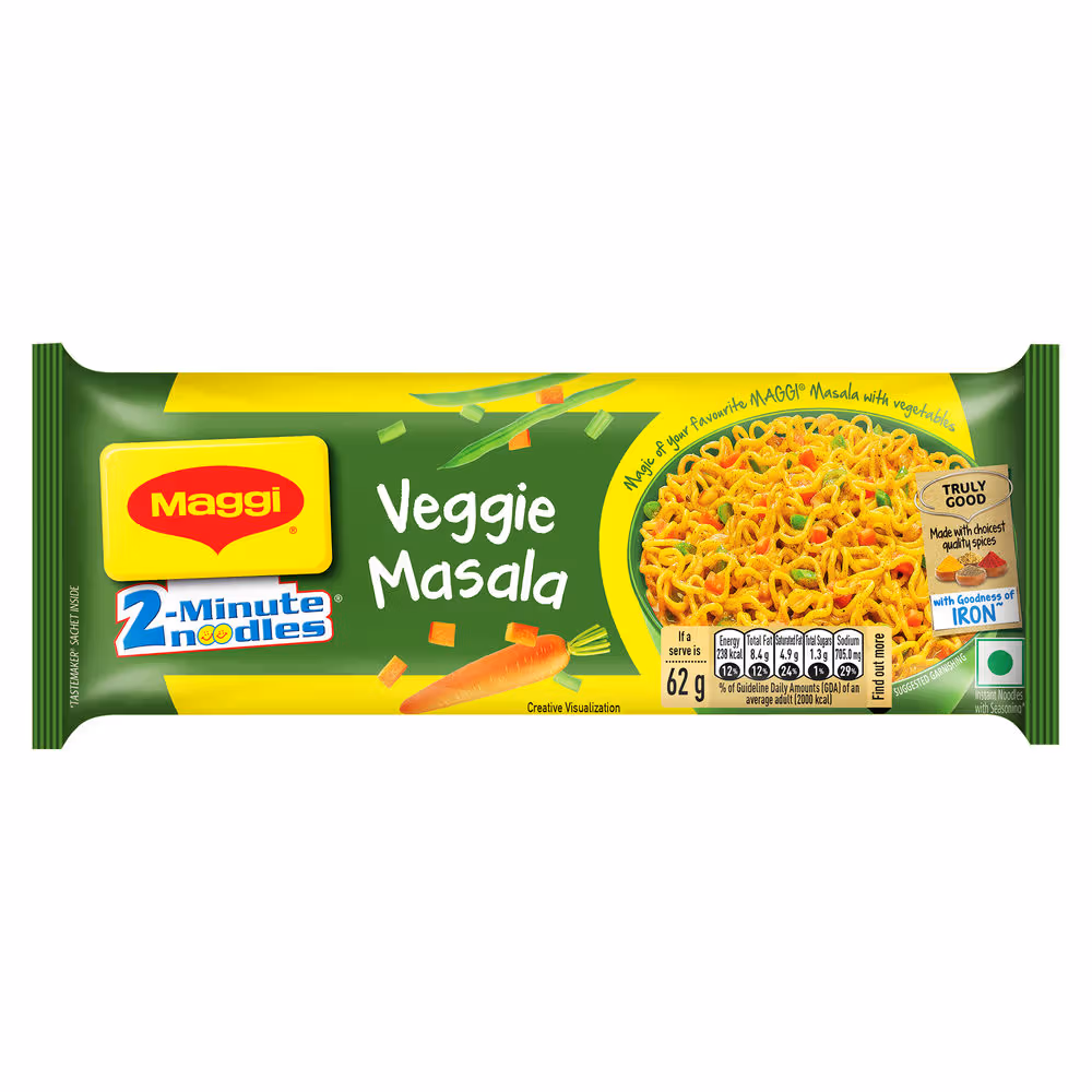 The delicious bowl of MAGGI Veggie Masala Noodles is now with colourful vegetables like carrots, onion and beans, MAGGI Noodles is made from the choicest quality spices to give it aroma and taste, This pack of instant noodles comes with magic of your favourite MAGGI Masala with vegetables