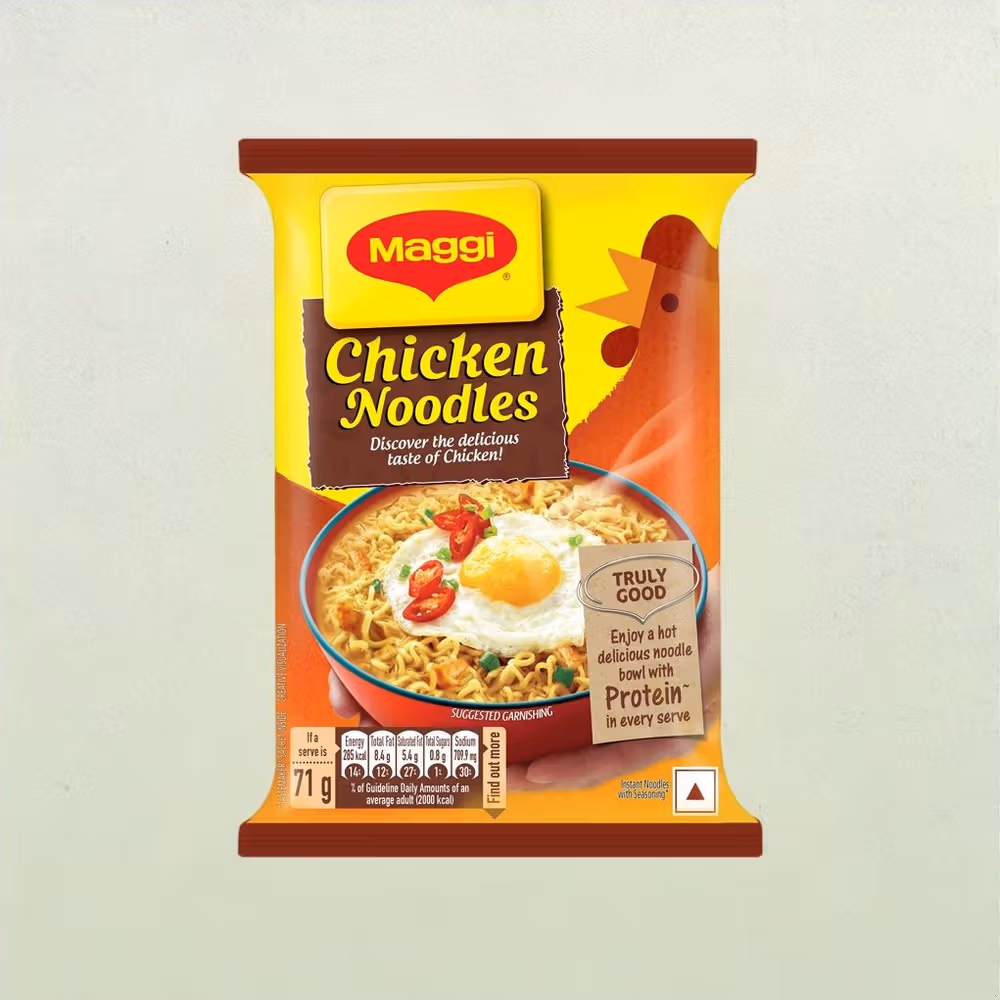 Break the Chicken Noodle cake into 4 parts. Add noodles and masala tastemaker to 225ml (1 cup) of boiling water. Cook for 3 minutes in an open pan. Stir occasionally. Do not drain the remaining water. Hold for 1 min. Serve hot