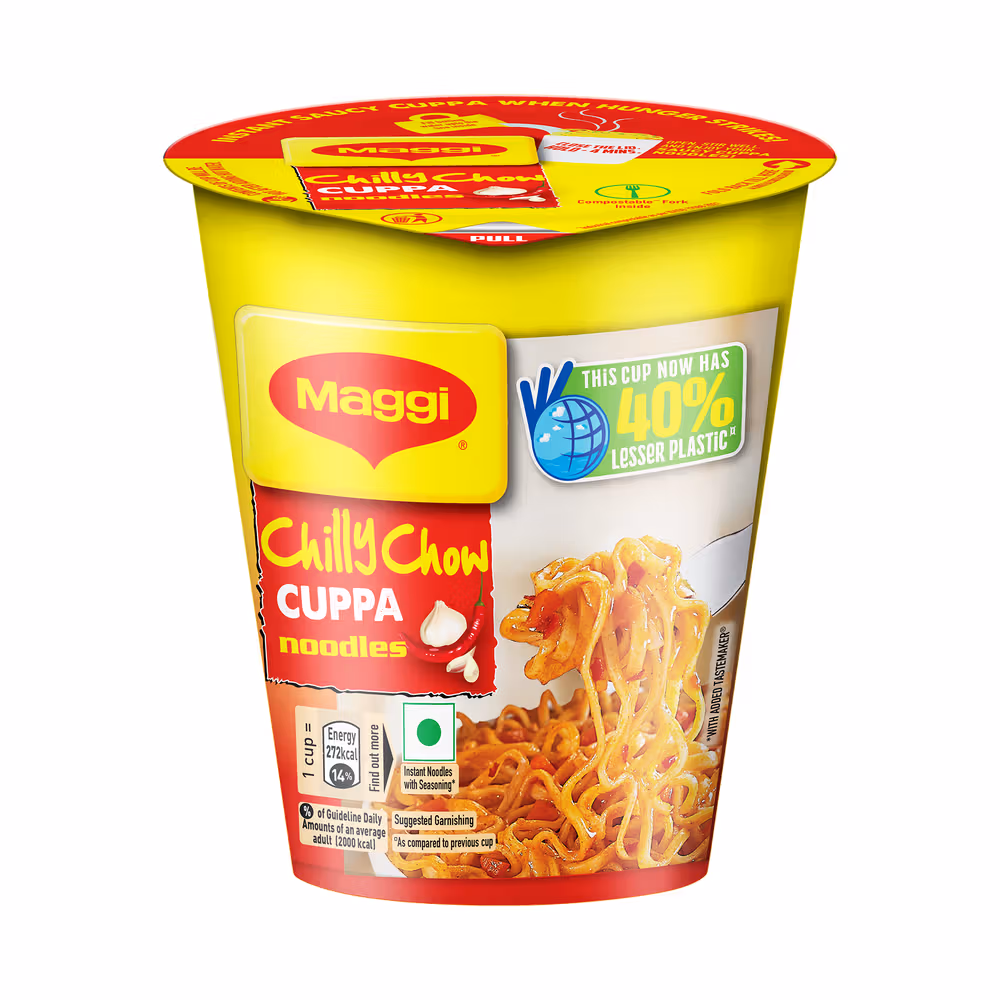 Maggi taste with a chilly chow twist in a convenient and ready-to-eat cup format. Maggi taste already added to the noodles. Ready in just 4 minutes Contains a fork inside for maximum convenience
