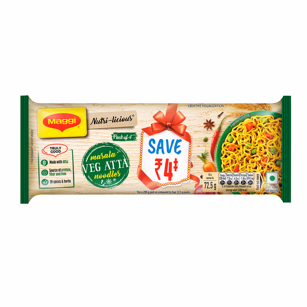 Delicious Maggi Veg Atta Noodles made with Atta and having colorful veggies. Made delicious with 20 spices and herbs. Source of iron, fiber and protein. Easy to cook, Maggi Veg Atta noodles take just 3 minutes