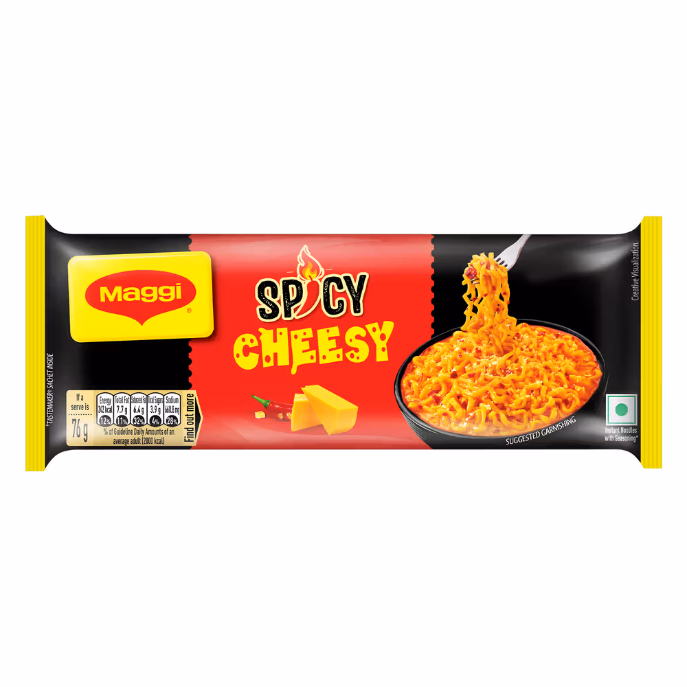Introducing the new Maggi Spicy Cheesy Noodles, Delight your taste buds with mouth-watering noodles where yummy cheese meets your favourite Maggi noodles, Your favourite noodles with a Spicy Cheesy twist that tantalizes your taste buds for an unforgettable experience, Relish the spicy cheesy twist with Maggi in 3 easy steps