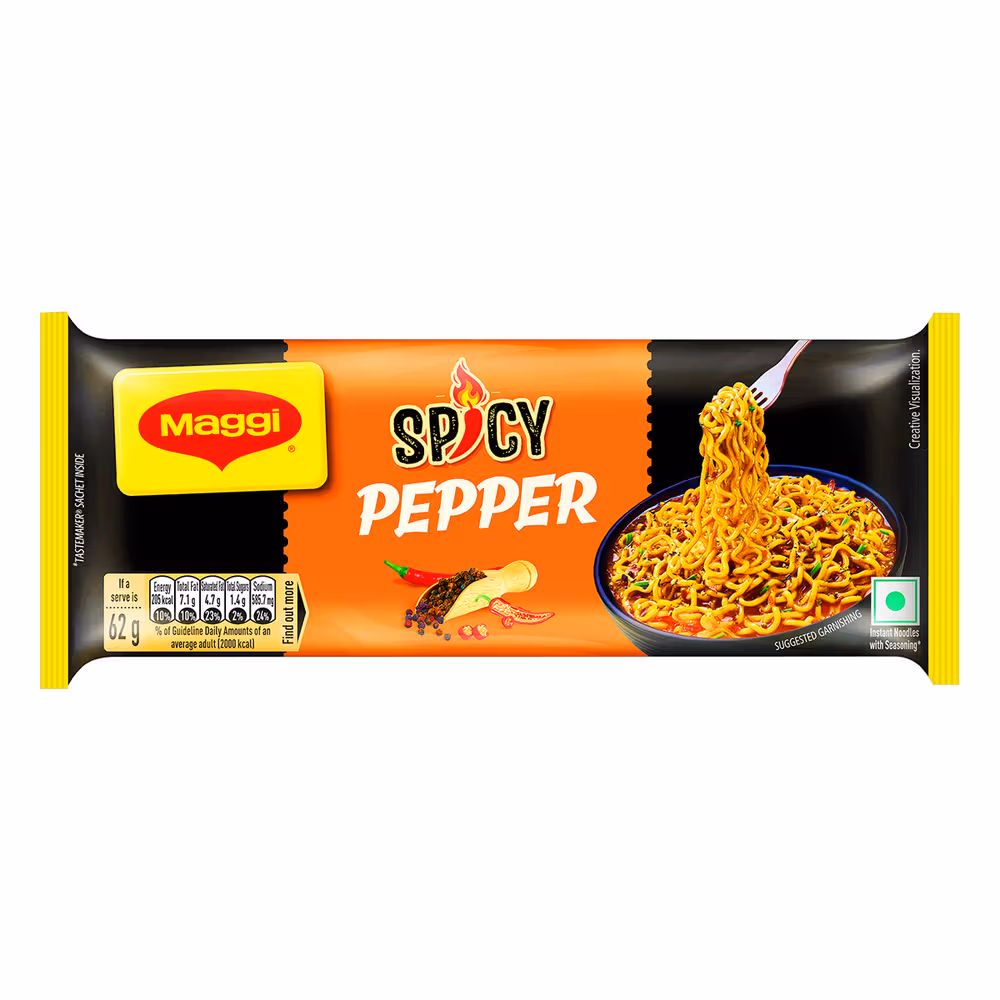 Noodles: Refined wheat flour (Maida), Palm oil, lodized salt, Wheat gluten, Thickeners (508 & 412), Acidity regulators (501(i) & 500 (i)) and Humectant (451(i)). Masala Tastemaker: Sugar, Garlic powder (12%), Red chilli powder (8%), Starch, Soya sauce powder (Soya sauce, Maltodextrin, lodized salt, Color (150c)), Toasted onion powder (Onion (5.4%) & Corn oil), Refined wheat flour (Maida), Capsicum extract, Onion powder, Flavour Enhancer (635), lodized salt, Black pepper powder (3%), Palm oil, Thickeners (508 & 412), Natural flavouring substances, Red chilli bits (2%), Nature identical flavouring substances, Acidity regulator (330), Colour (150d), Spice extract blend and Wheat gluten