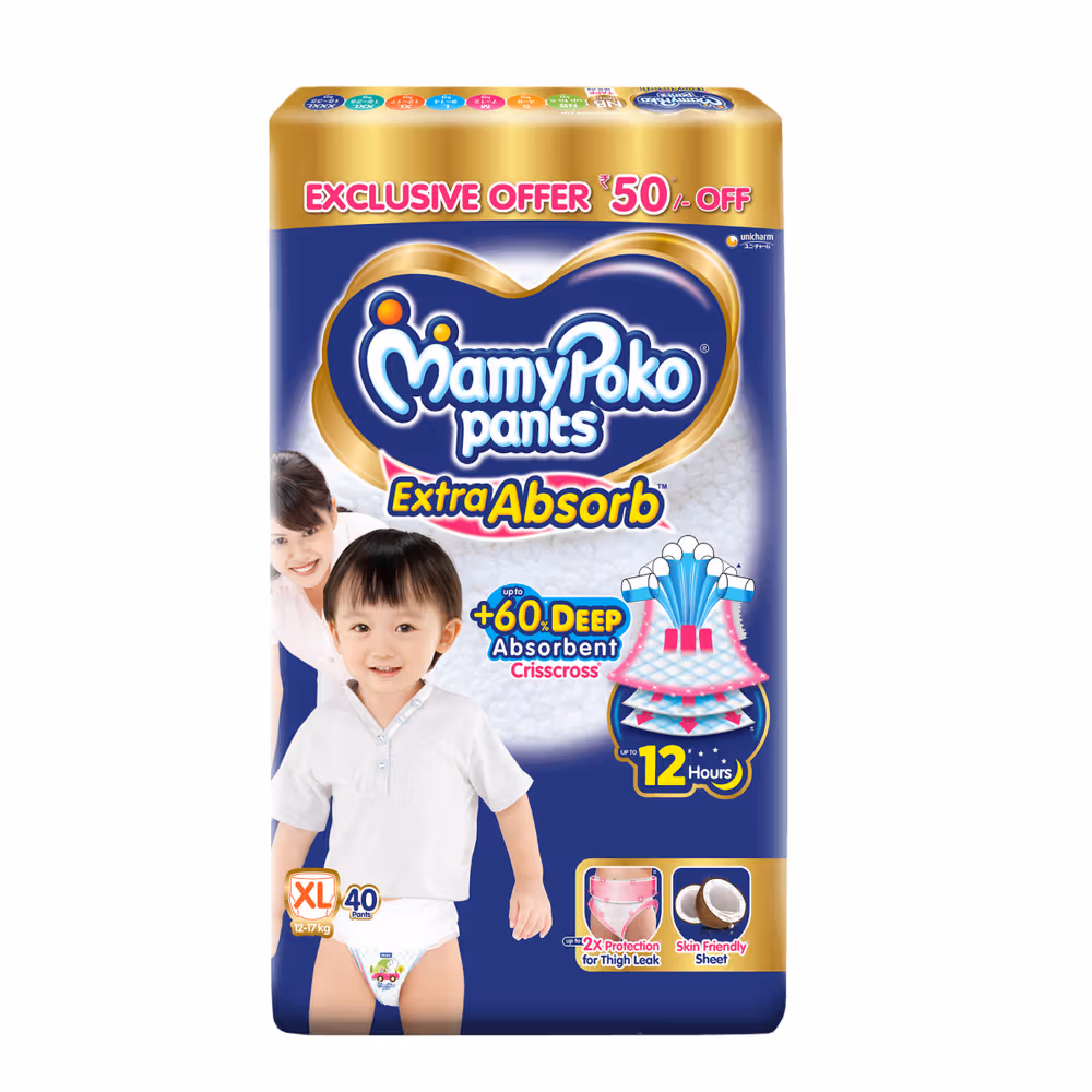 Our first deep sleep diaper which helps in deep and better quality sleep for babies. deep absorbent crisscross sheet: 3 layer deep absorption leaves no wetness on the topsheet, and no heaviness on bottom, so prevents leakage without sogginess for upto 12 hours. no sogginess: keeps baby's gentle skin dry. innovative flexi fit - the waistband is made of premium and soft non woven stretchy material that adjusts gently and fits perfectly across baby's tummy, preventing red marks. 2x protection from thigh leakage: perfect fit helps the diaper stay in place preventing any thigh gaps and hence gives 2x protection for thigh leakage. skin friendly diaper - the topsheet is enriched with the goodness of coconut extracts which nourishes and soothes skin. it helps in preventing rashes. easy to wear and remove pant style diapers