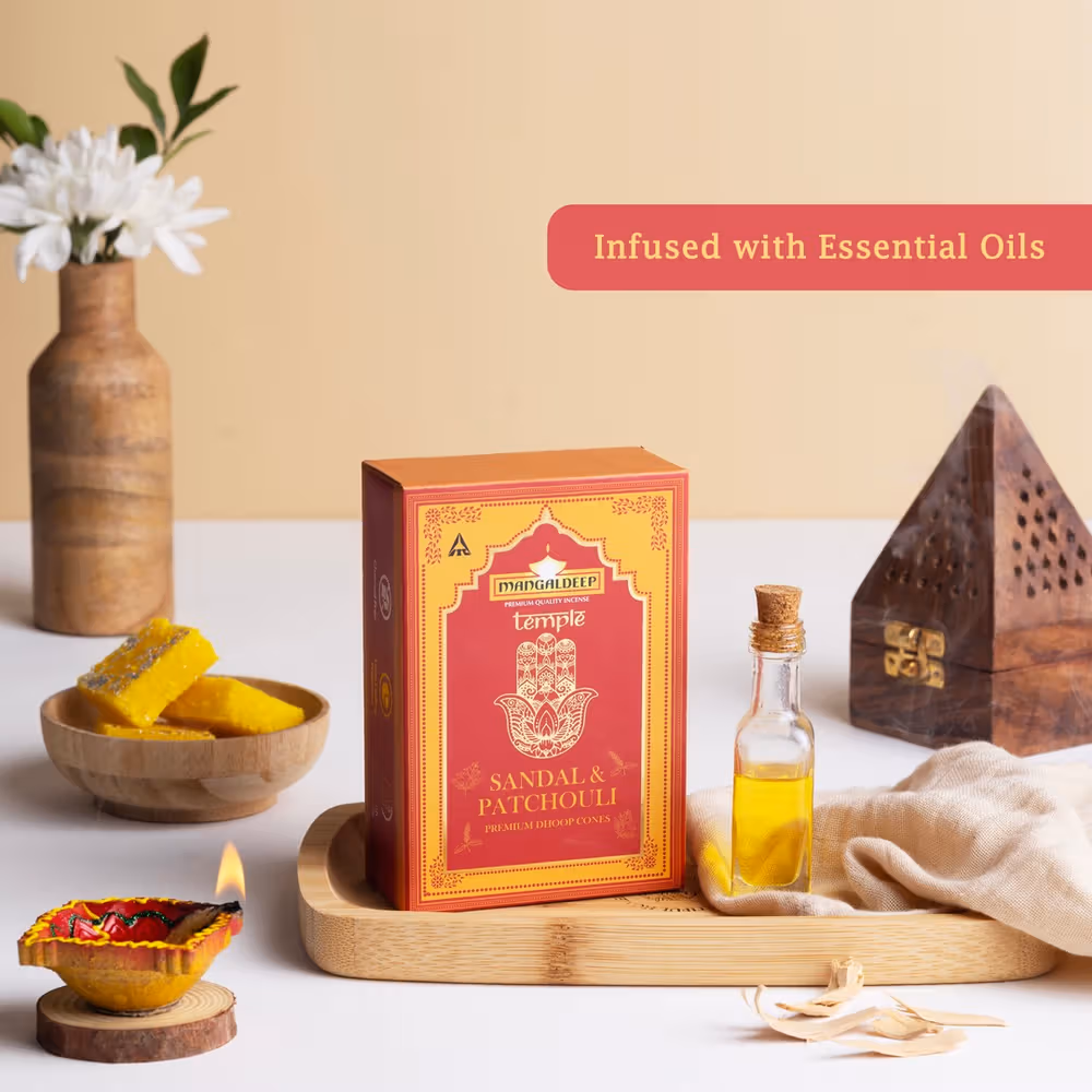 Mangaldeep Temple Premium Dhoop Cones offer a blend of sandalwood and patchouli fragrances, creating a calming and inviting aroma for spiritual practices and relaxation