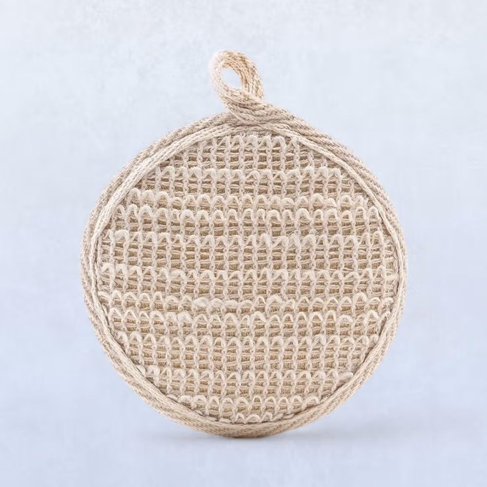 Deeply cleanses and exfoliates, made from natural ramie fabric, convenient hand band for easy grip, hook and loop design for drying