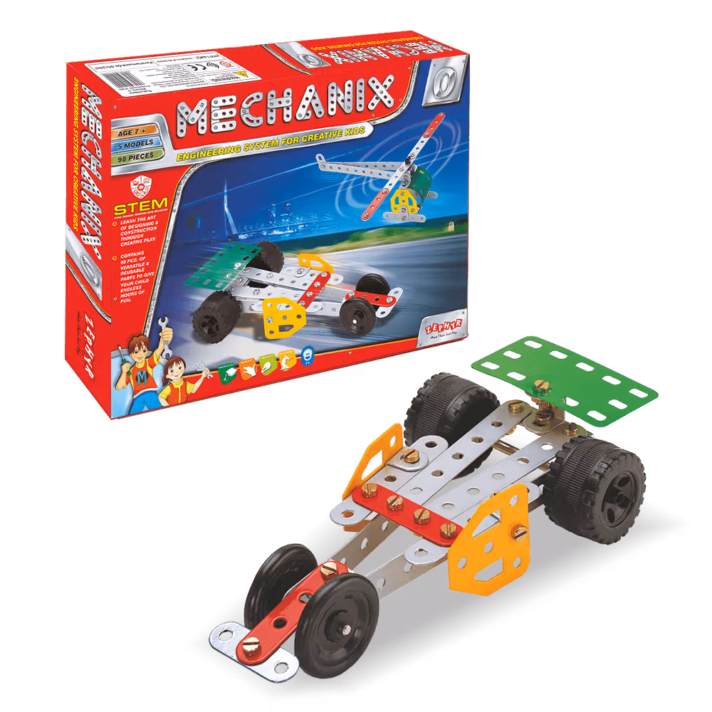 Build 5 different vehicle models at once, High-quality steel construction parts, Step-by-step illustrated instruction manual, Develops STEM learning and motor skills