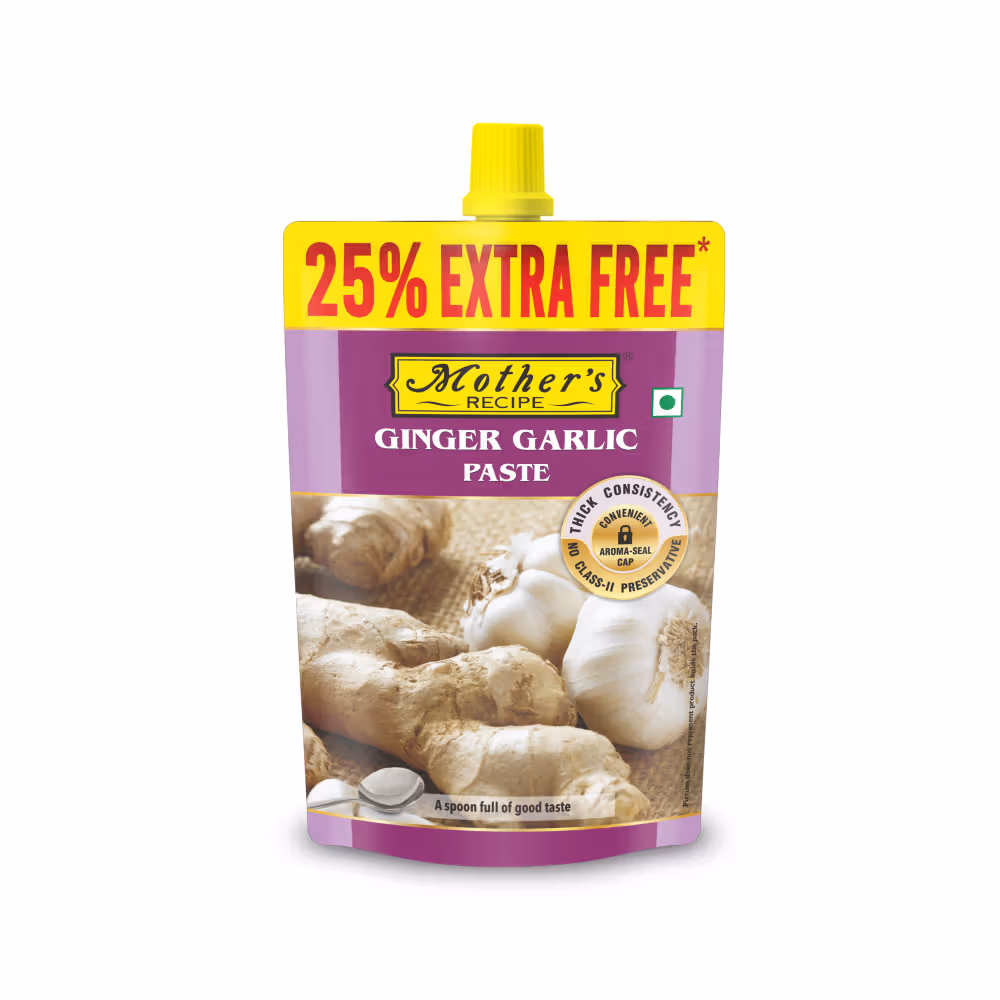 Rich ginger and garlic blend, enhances flavor in dishes, convenient pouch packaging, ideal for Indian cuisine