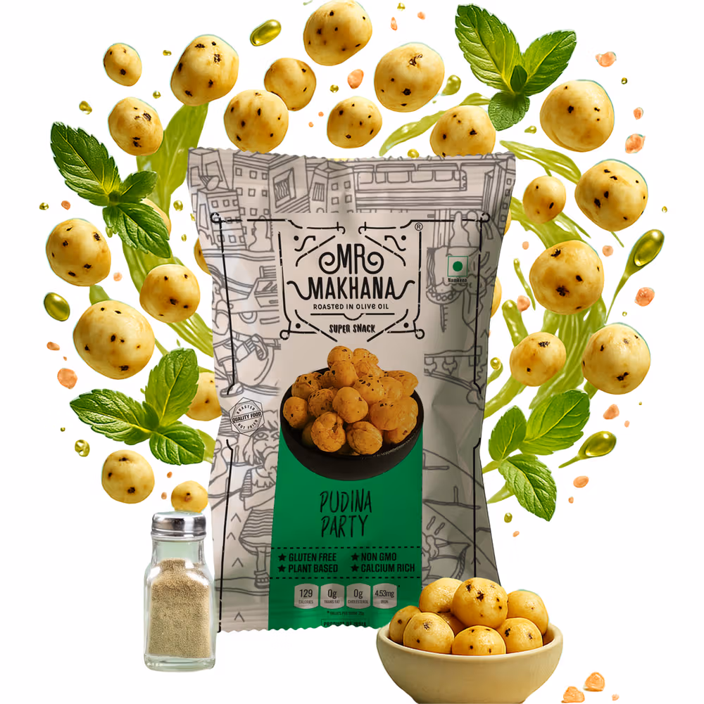 Makhana (Popped Lotus Seeds) 70%, Olive Oil 18%, Spices and Condiments 10% (Dried Ginger, Dried Mango, Dried Garlic, Green Chilli, Coriander Leaves, Cumin, Cardamom, Turmeric, Fennel, Black Pepper, Clove, Nutmeg, Mace, Carom Seeds), Salt, Sugar, Lemon Powder, Mint Leaves, Maltodextrin, Acidity Regulator (Citric acid E330), Flavour Enhancer (Disodium 5'-ribonucleotides E635)