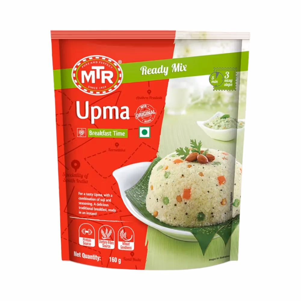 Semolina (75%), Edible Vegetable fat-interesterified (Made from any or all of the following permitted Vegetable Oils: Palmolein Oil, Rice Bran Oil, Soyabean Oil, Maize (Corn) Oil, Sesame Oil, Groundnut Oil), Salt, Bengalgram Dal, Anticaking agent Silica (INS 551), Green Chilli, Ginger, Curry Leaves, Sugar, Mustard, Acidity Regulator: Citric Acid (INS 330) and Tartaric acid (INS 334)