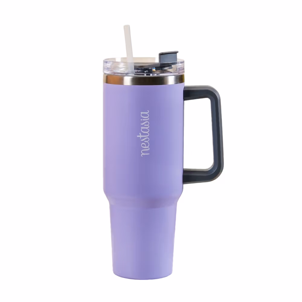 Double-wall vacuum insulation, bpa and toxin-free material, powder-coated matte finish, includes reusable straw and lid