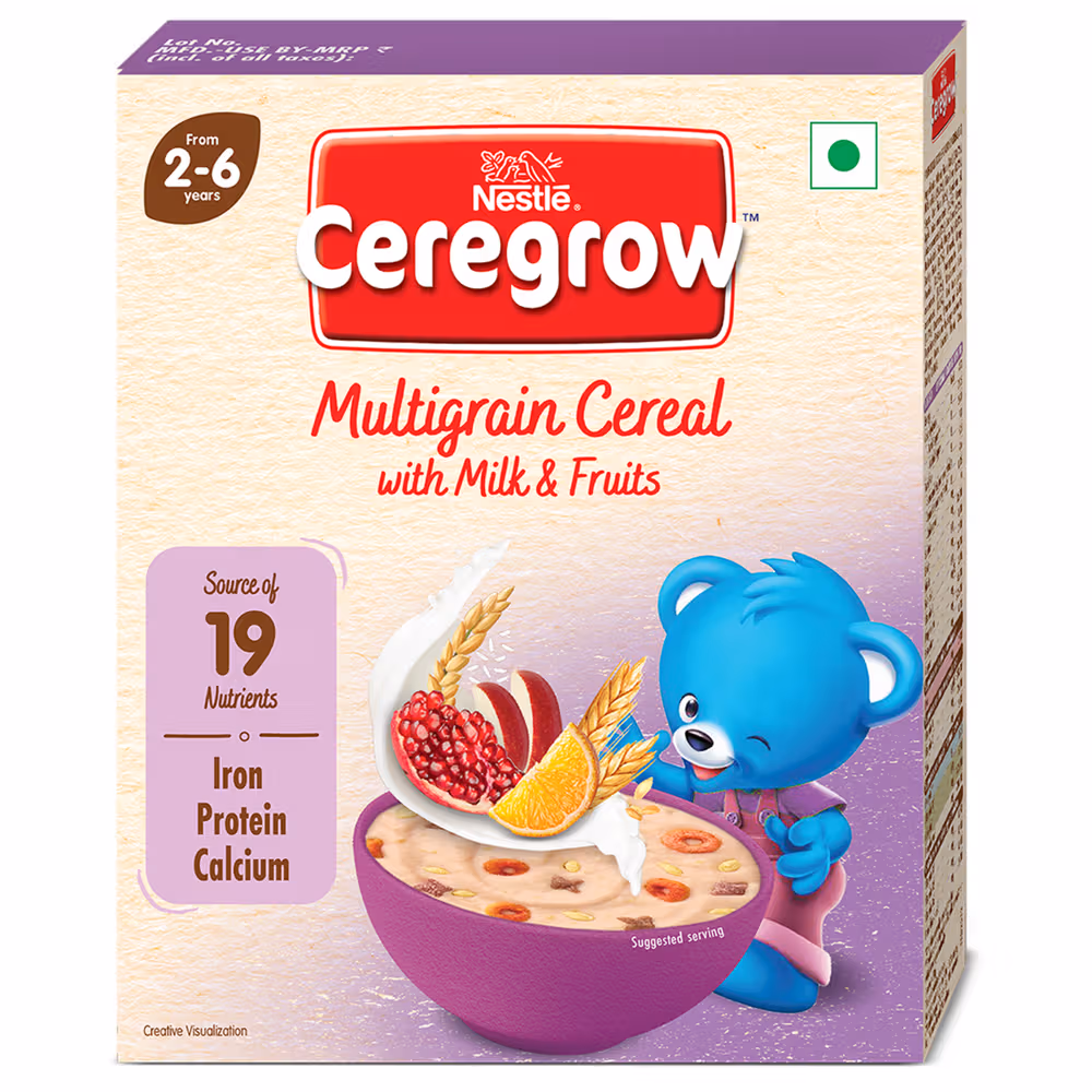 Wheat flour (Atta) (38.7%), Milk solids (26.8%), Rice flour (8.3%), Sugar, Oat flour (6%), Soyabean oil, Apple juice concentrate (3.5%), Orange juice concentrate (3%), Corn flour (2.3%), Maltodextrin, Starch, Mango Pulp (0.8%), Barley flour (0.7%), Minerals, Mango Powder (0.5%), Pomegranate Juice concentrate (0.4%), Blackcurrant Juice concentrate (0.3%), Red Beet puree (0.1%), Dextrose, Vitamins and Acidity Regulator (Potassium hydrogen carbonate) Allergen Note: Contains Wheat, Oats, Barley & Milk