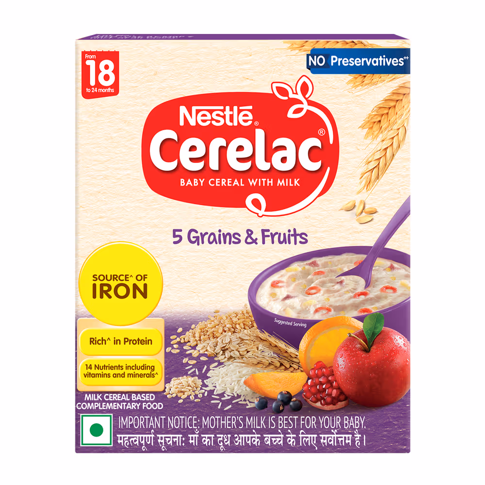 Nestle cerelac 5 grains and fruits is a complementary baby food for infants from 18 to 24 months. 2 Serves of cerelac 5 grains and fruits cereal provide 37% of a baby’s daily need of iron. It is also a source of 14 important nutrients including vitamins and minerals. This baby food cereal is rich in protein and packed with the goodness of cereal, milk, and fruits. Mother’s milk is best for the baby