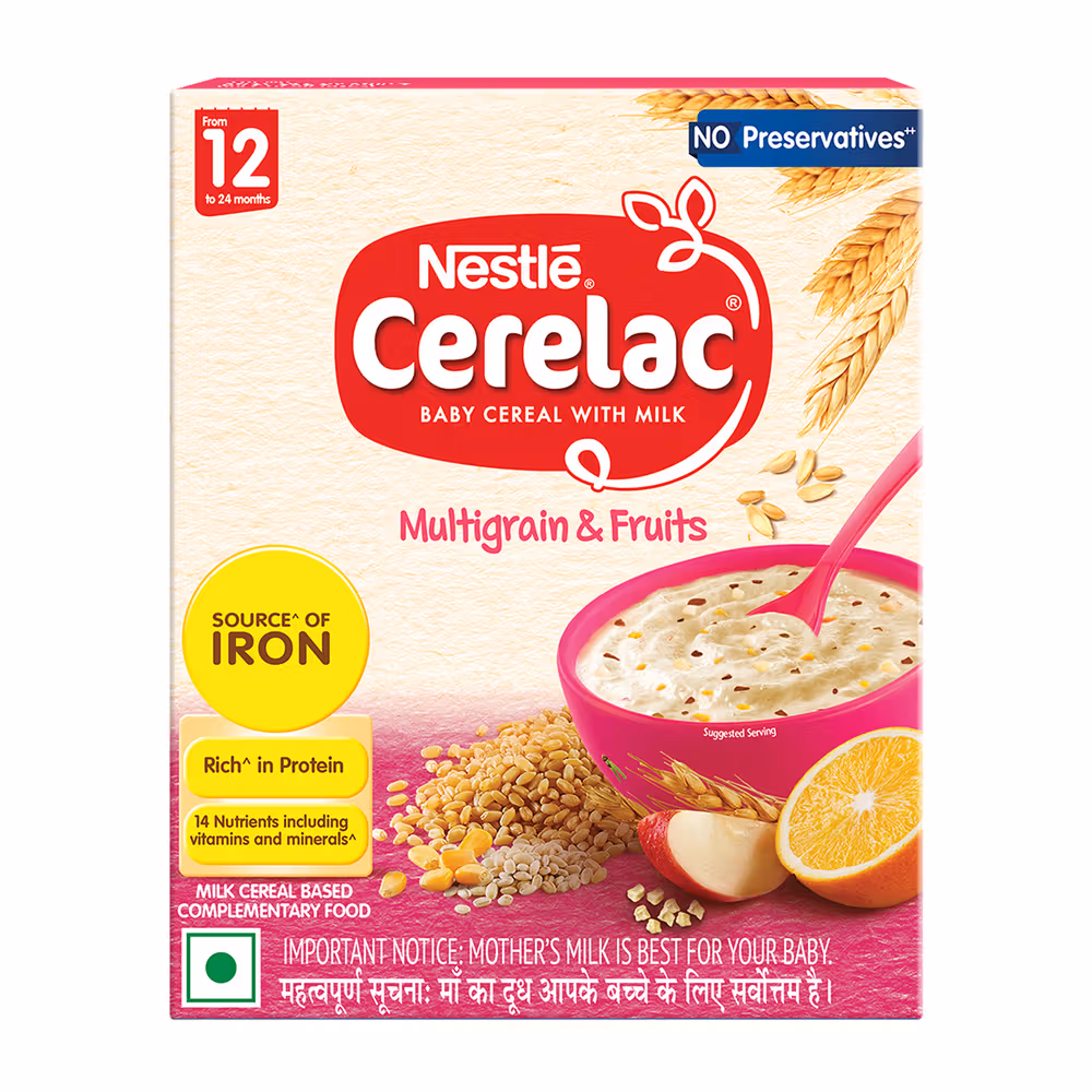 Nestle cerelac multigrain and fruits is a complementary baby food for infants from 12 to 24 months. 2 Serves of cerelac multigrain and fruits cereal provide 37% of a baby’s daily need of iron. It is also a source of 14 important nutrients including vitamins and minerals. This baby food cereal is rich in protein and packed with the goodness of cereal, milk, and fruits. Mother’s milk is best for the baby