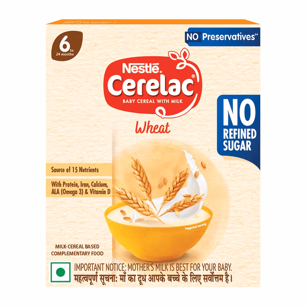 Nestle cerelac wheat with no refined sugar is a complementary baby food for infants from 6 to 24 months. It is also a source of 15 important nutrients including vitamins and minerals. With iron, protein, calcium, ALA (omega 3) and vitamin D. This baby food cereal is packed with the goodness of cereal and milk. Mother’s milk is best for the baby