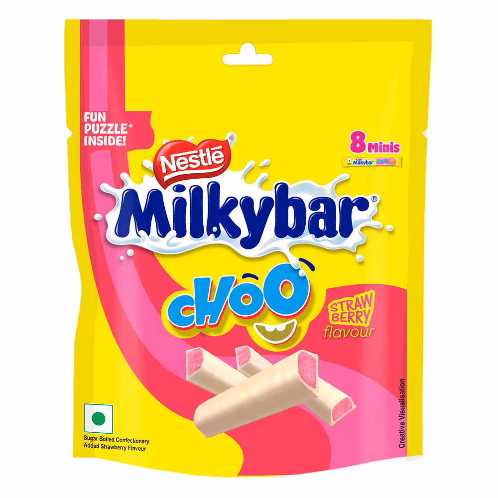 Keep chewing with Nestle Milkybar Choo Strawberry Treats. Each pack contains 8 mini treats with a chewy strawberry center covered in a milky layer. It includes fun 3D puzzles for an engaging experience