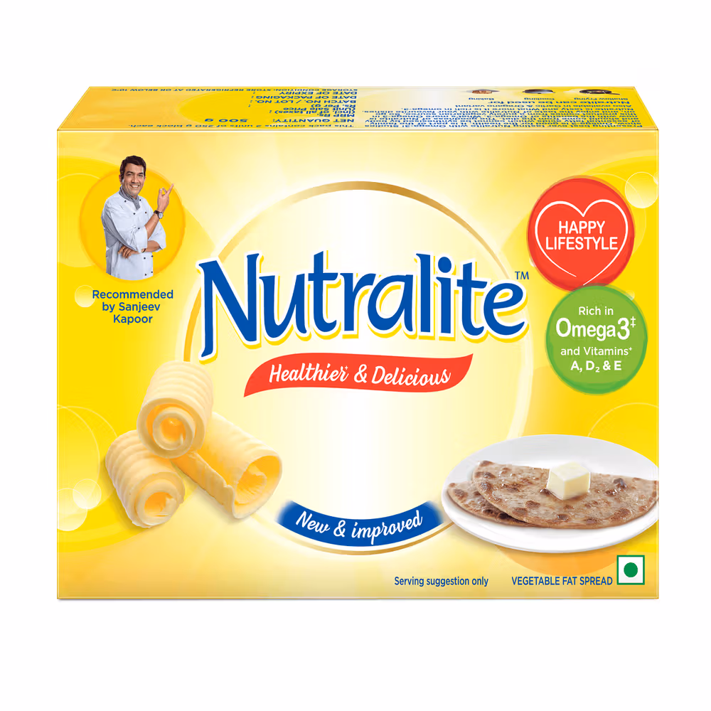 Edible Vegetable Oils (Refined Palm and Palm Kernel Oil, Sunflower Oil, Sesame Oil, Linseed Oil (Source Of Omega-3)), Water, Common Salt, Milk Solids, Emulsifiers (INS 471, INS 322), Preservatives (INS 202, INS 200), Thickener (INS 415), Acidity Regulator (INS 330), Nature Identical (Butter) Flavouring Substances, Starch, Vitamins, Sequestering Agent (INS 385), Natural Colour (INS 160A (ii)), Antioxidant (INS 319)