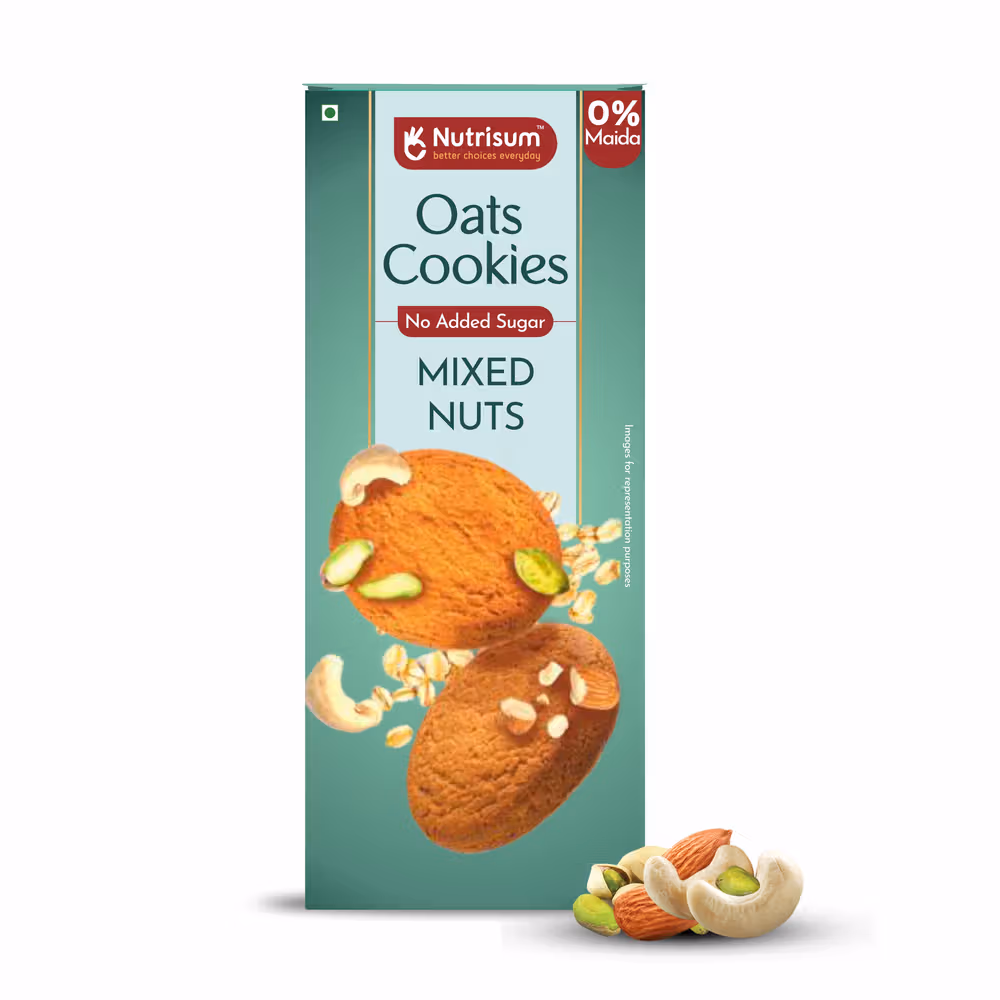 Oats Flour (25%), Wheat Flour (Atta) (25%), Hydrogenated Vegetable Fat, Nuts 8% (Cashew 5%, Almonds 2%, Pistachio 1%), Fructo Oligosaccharides, Sweeteners (INS 965(I), INS 955), Milk Solids, Raising Agents (INS 500(Ii), INS 503(Ii)), Salt, Natural, and Nature Identical Flavouring Substances