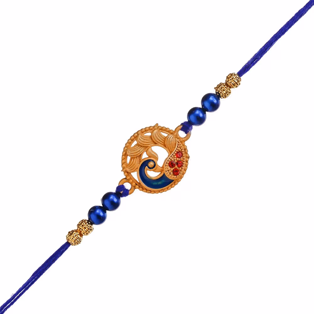 Elegant peacock design with blue pearls, gold accents enhance traditional appeal, includes roli chawal for complete ritual, durable thread construction for comfort