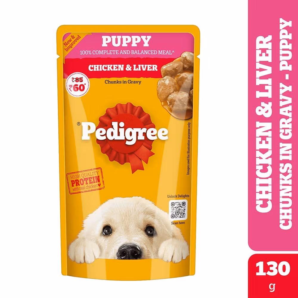 100% complete and balanced meal, wet dog food with a gravylicious flavour, specially formulated for puppies, made with real meat & high quality protein, protein & Calcium support strong muscles & bones.