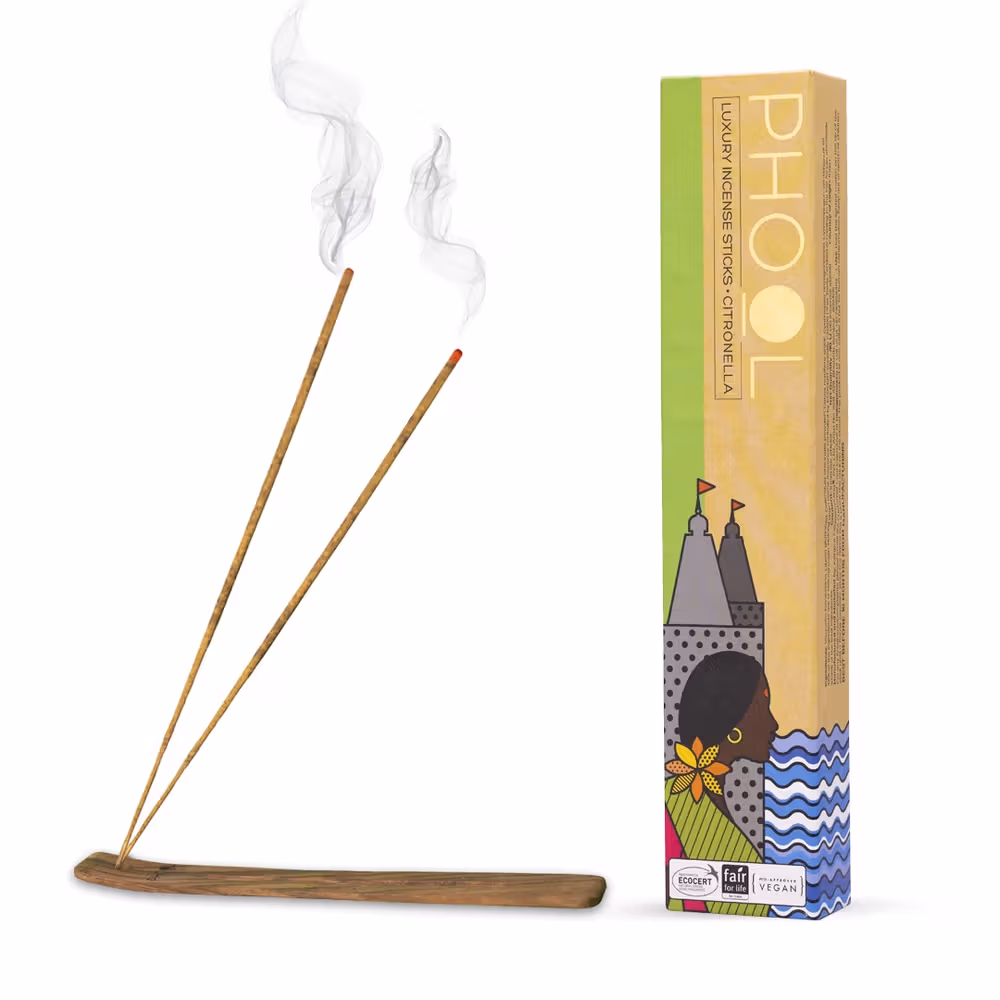 100% natural certified incense, chemical-free and safe, soothing citronella fragrance, handcrafted from temple flowers