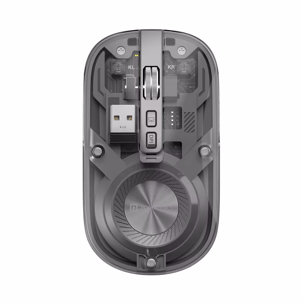 Premium transparent design showcases internals, dual wireless connectivity for versatility, silent clicking for quiet workspaces