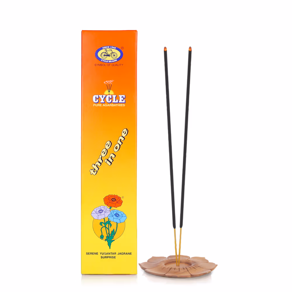 Cycle Pure Three in One Agarbatti blends three fragrances, Serene, Yugantar, and Jagrane, creating a peaceful environment for health, wealth, and happiness