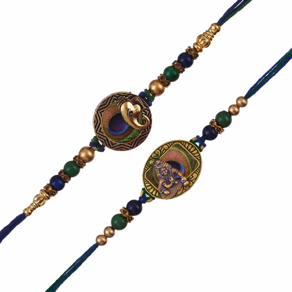 Divine Lord Ganesha and Krishna motifs, crafted with vibrant peacock feather design, includes traditional roli chawal pack