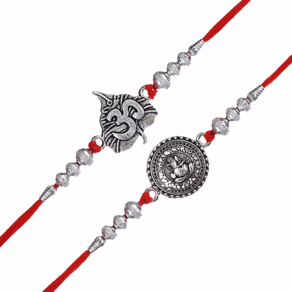 Divine Ganesha and Om symbol designs, premium silver beaded embellishments, traditional red thread craftsmanship