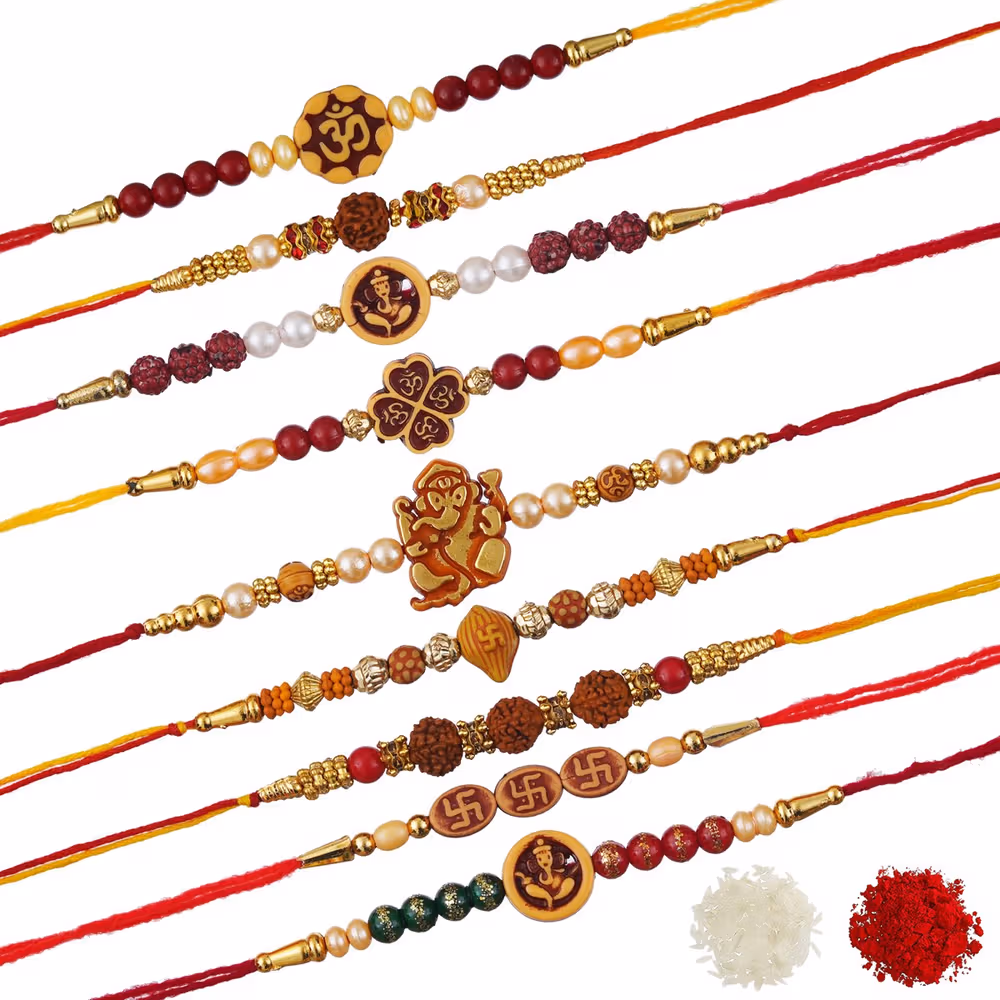 Spiritual symbolism with Om and Ganesha, intricate craftsmanship with vibrant colors, includes traditional roli chawal, perfect for raksha bandhan celebration