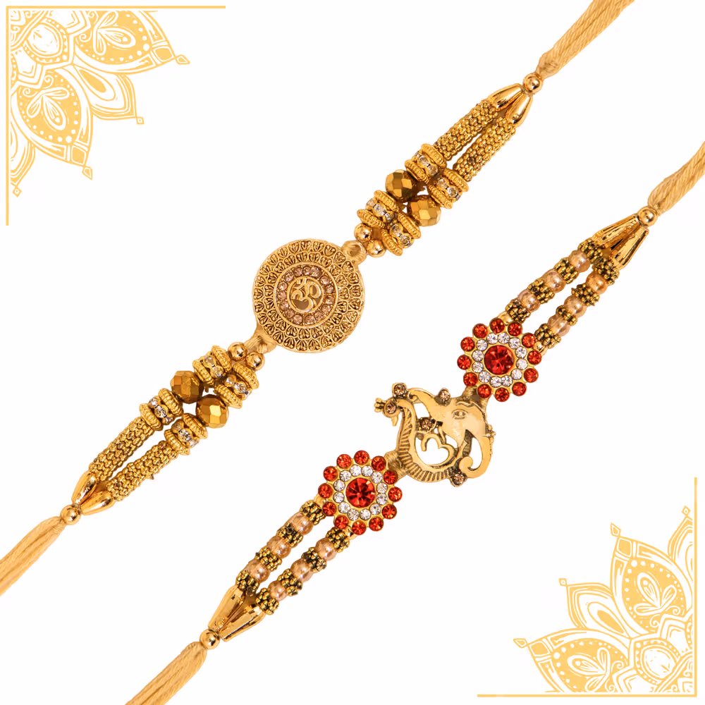 2 x Brother Rakhi, 1 x Rakhi Card, 1 x Roli Chawal Tika Chandan Pack, and 1 x Organza Potli Bag