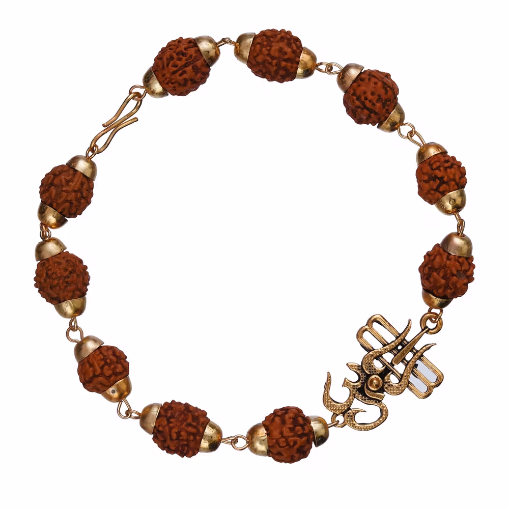 Spiritual Om and Trishul design elements, traditional rudraksha bead embellishments, comes with auspicious roli chawal pack