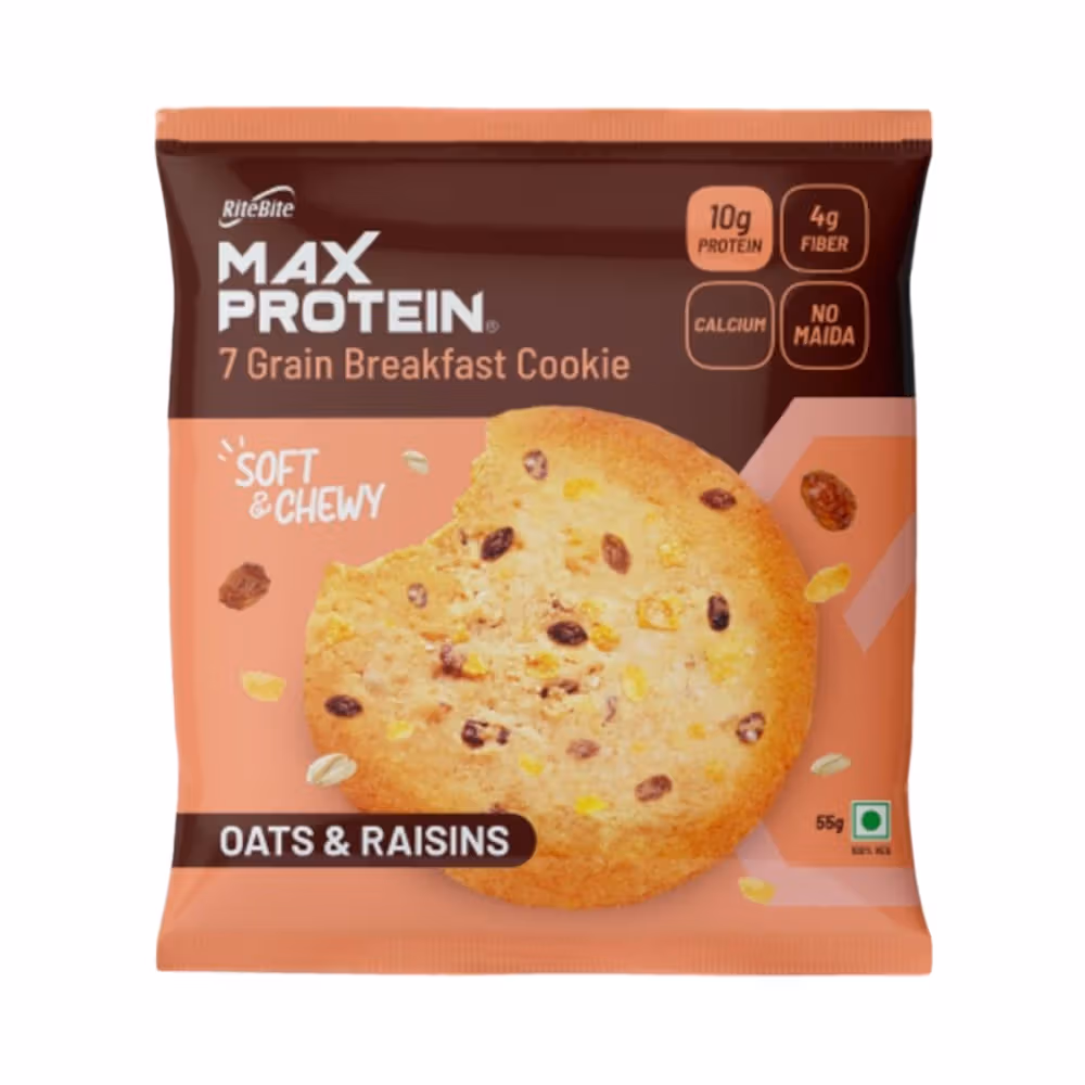 Soft and chewy texture, 10g protein per cookie, no maida or preservatives, made with 7 grains