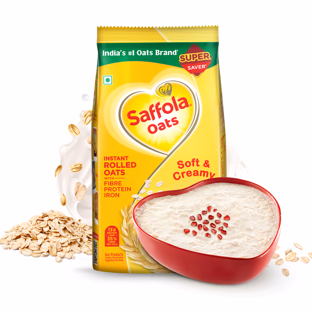Saffola Oats are 100% instant rolled oats, sourced globally for a creamy texture, ready in 3 mins, they're versatile for dishes like upma or smoothies, rich in protein, fiber, and iron, they're India’s No.1 Oats Brand, also available in tasty flavors like masala and chocolate