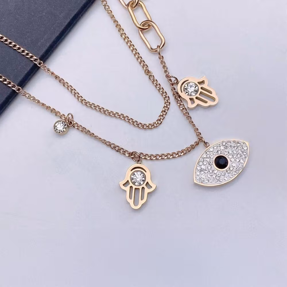 Layered design with protective symbols, Anti-tarnish rose gold finish, Crystal-embellished evil eye and hamsa charms