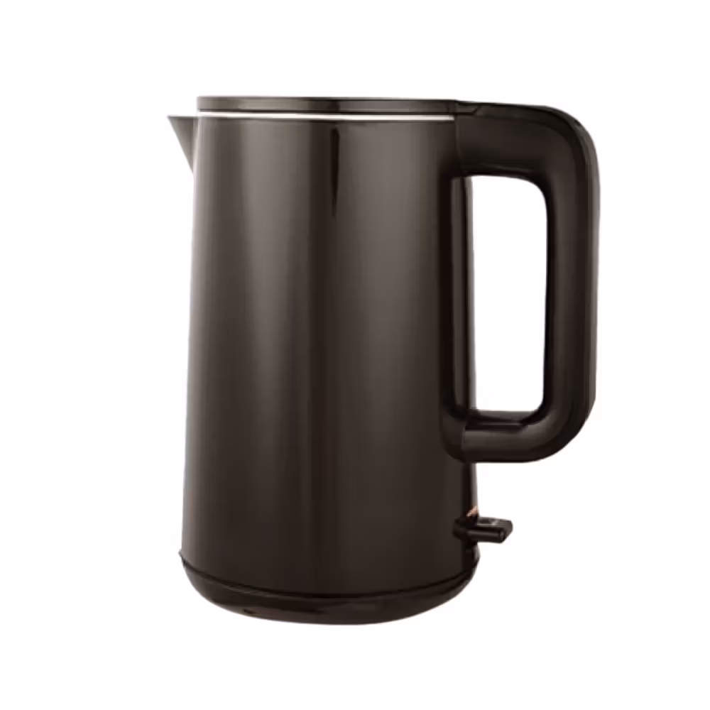 Double-layered stainless steel, boils water in 5 minutes, auto cut-off for safety, 360-degree swivel base