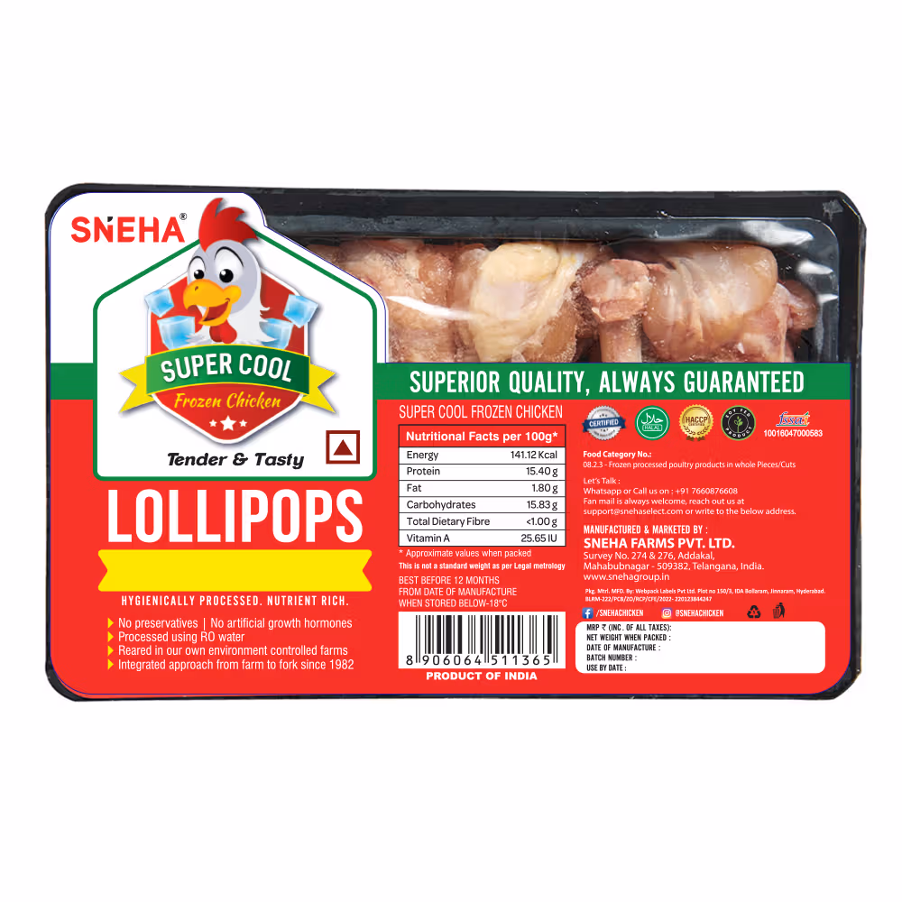 Premium quality chicken lollipops, No preservatives or growth hormones, Hygienically processed with RO water