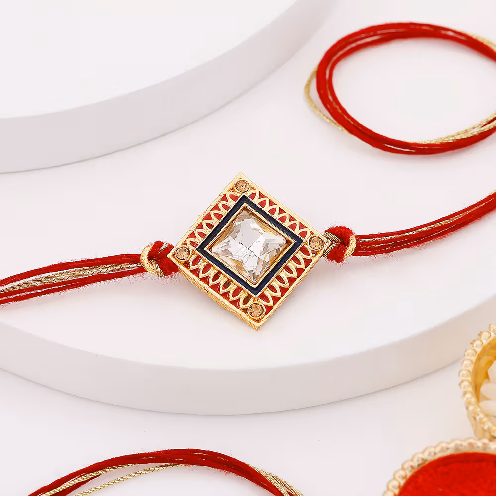 Diamond-shaped pendant with CZ stone, red and gold thread combination, traditional geometric pattern, adjustable design for perfect fit