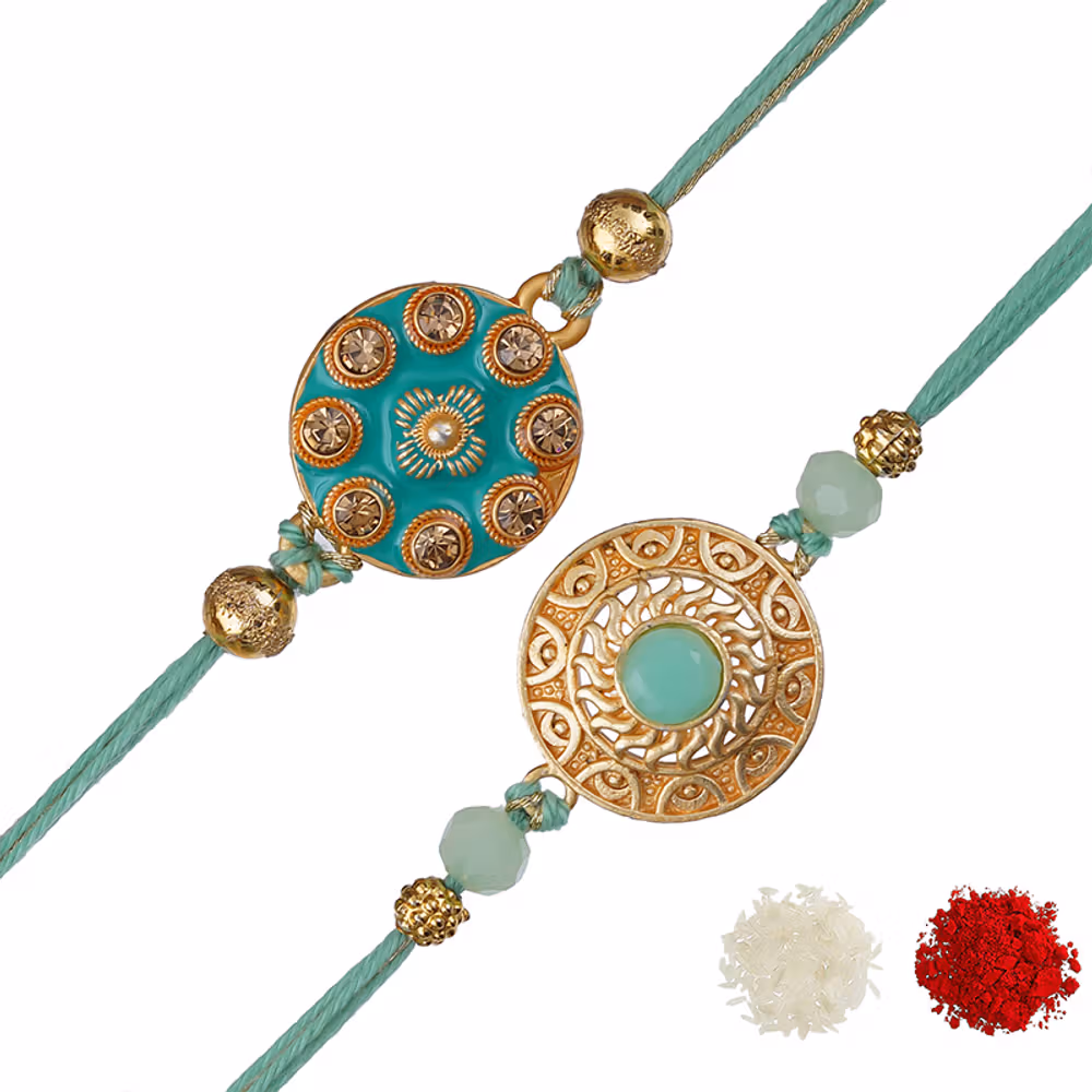 Elegant traditional design with stones, handcrafted with premium materials, vibrant turquoise and gold combination, complete with ceremonial roli chawal
